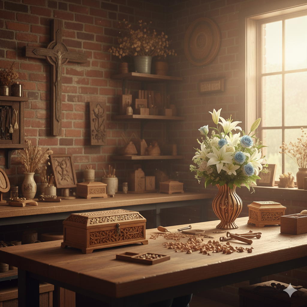 We invite you to discover unique floral and wooden treasures. Each piece is thoughtfully crafted, specifically for you, reflecting the intricate beauty of His creation. From sculptural forms adorned with delicate floral designs to cherished wooden heirlooms, our creations tell a story of dedicated craftsmanship and a commitment to honoring Him.